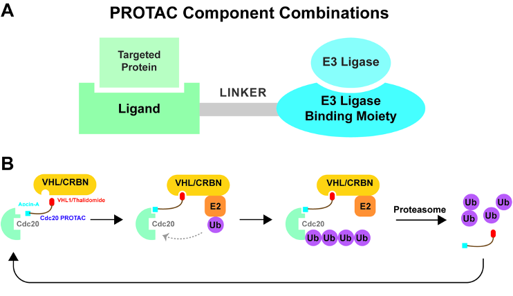 (A) Design and (B) mechanism of action of Cdc20 PROTAC.