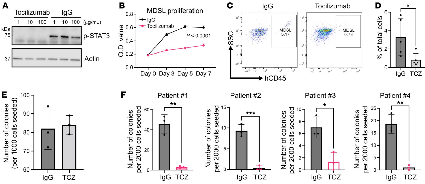 Tocilizumab (TCZ) reduces cell proliferation and colony formation in MDS patient cells.